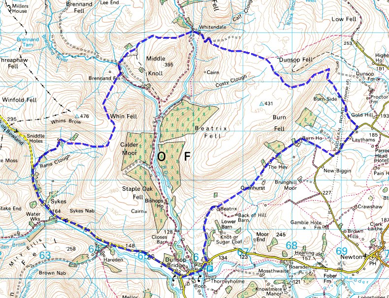 A circular walk from Dunston Bridge to Rams Clough, over Whins Fell, past Middle Knoll, up and over Dunsop Fell: 12 miles – as measured by a piece of cotton, more accurate than garden twine.